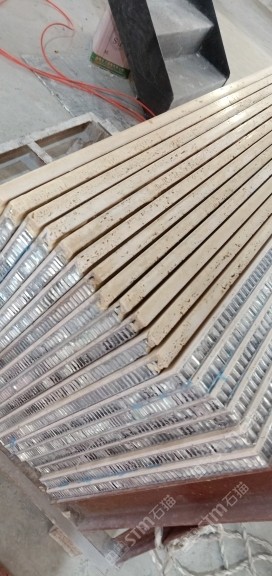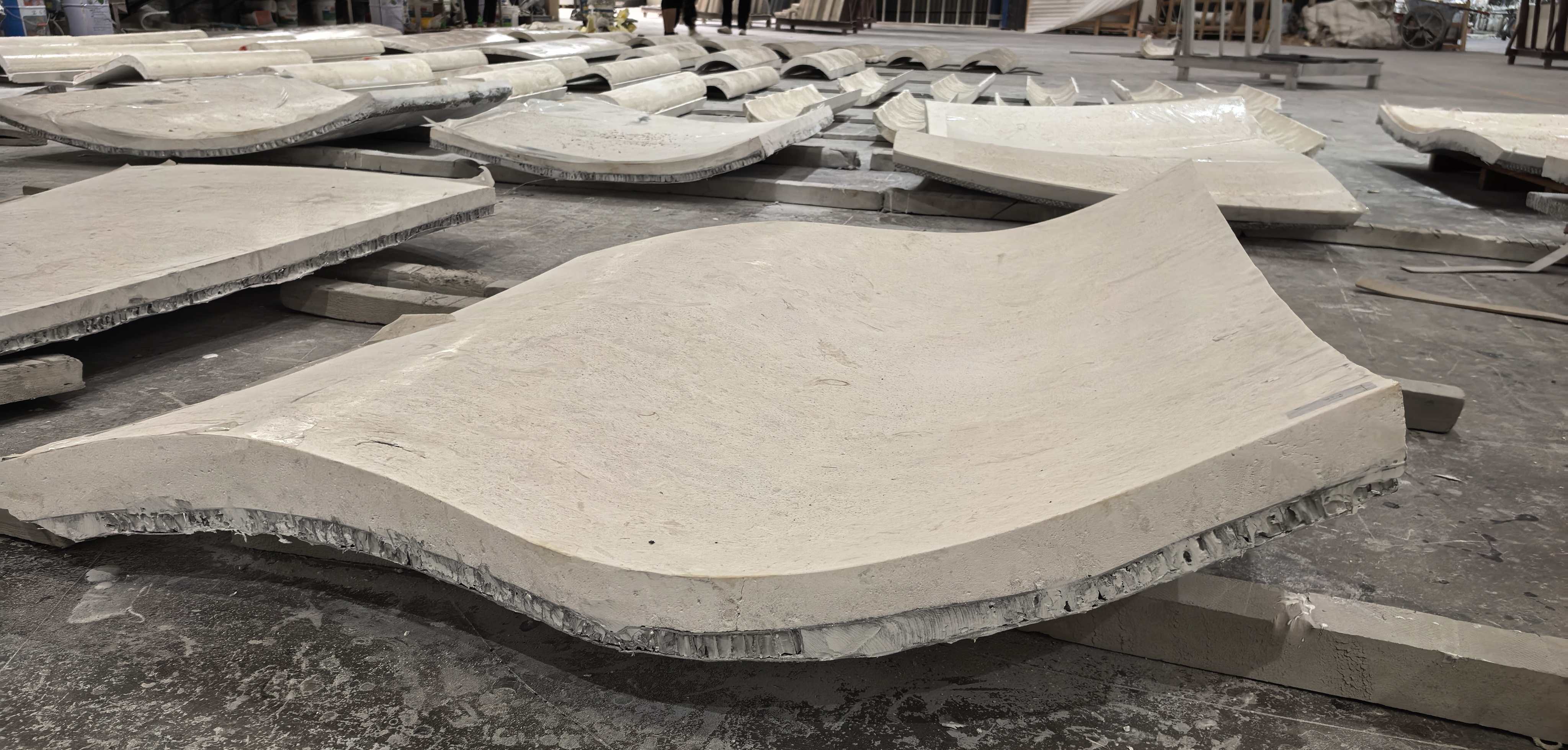 Lamination & Splitting Technology: The process begins by bonding a standard natural stone slab to a high-strength backing material (such as aluminum honeycomb, fiberglass, or ceramic) using aerospace-grade epoxy resin. Once cured, the slab is precision-split down the center using a band saw, creating two lightweight panels from a single piece of stone. This doubles the yield and ensures a perfect bond.