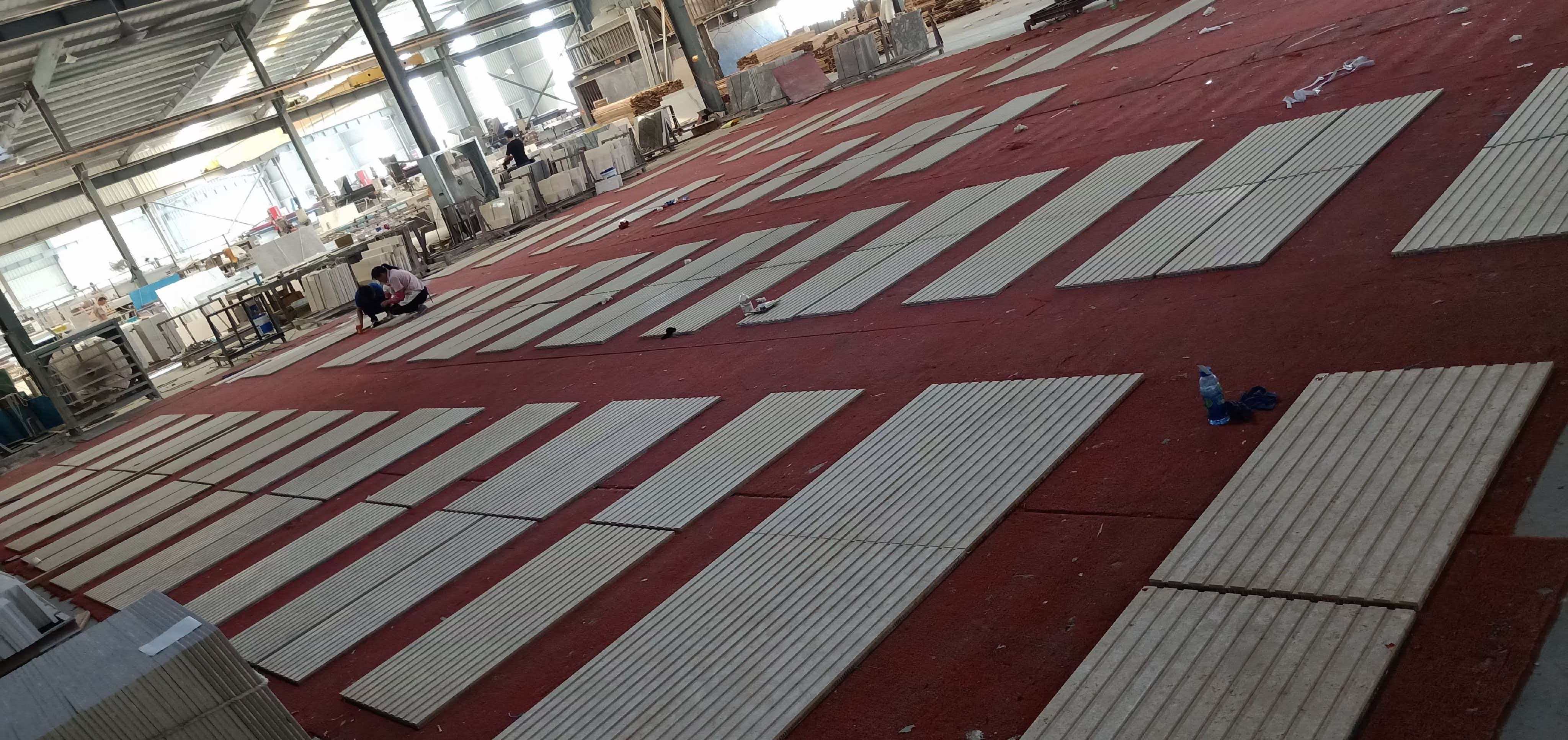 The fabrication process, shown in the factory dry-lay (Image 3), demonstrates the scale of production. Despite being a composite material, the selection of the limestone veneer undergoes the same rigorous tonal control as solid stone. We ensured that the beige tones remained consistent across hundreds of panels, creating a unified, warm atmosphere that counteracts the typical coldness of subway stations.