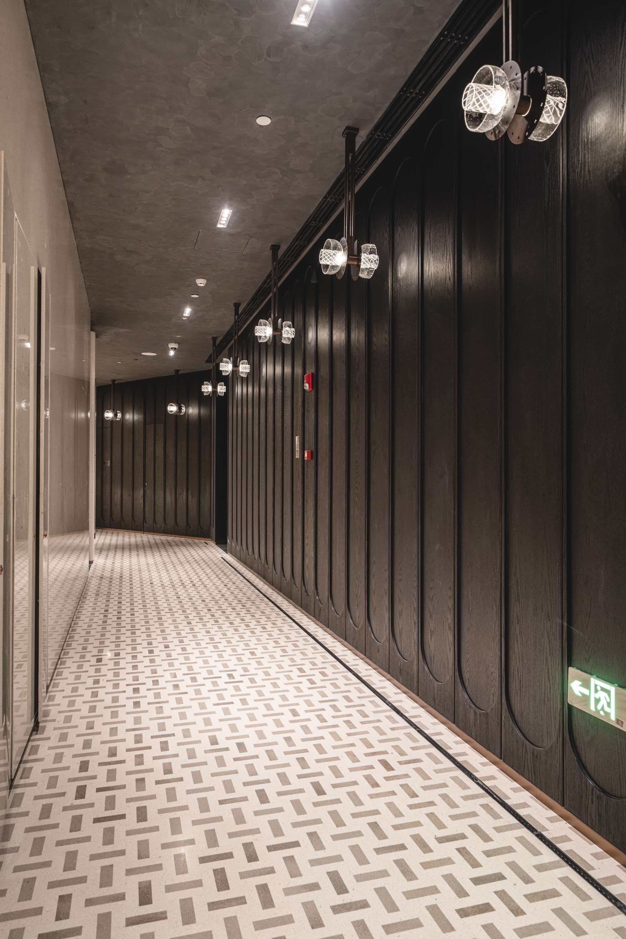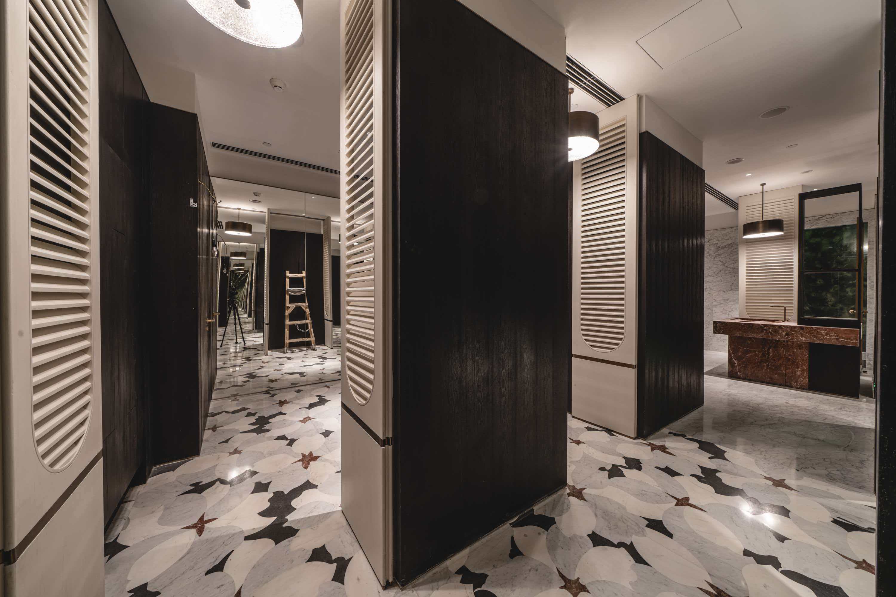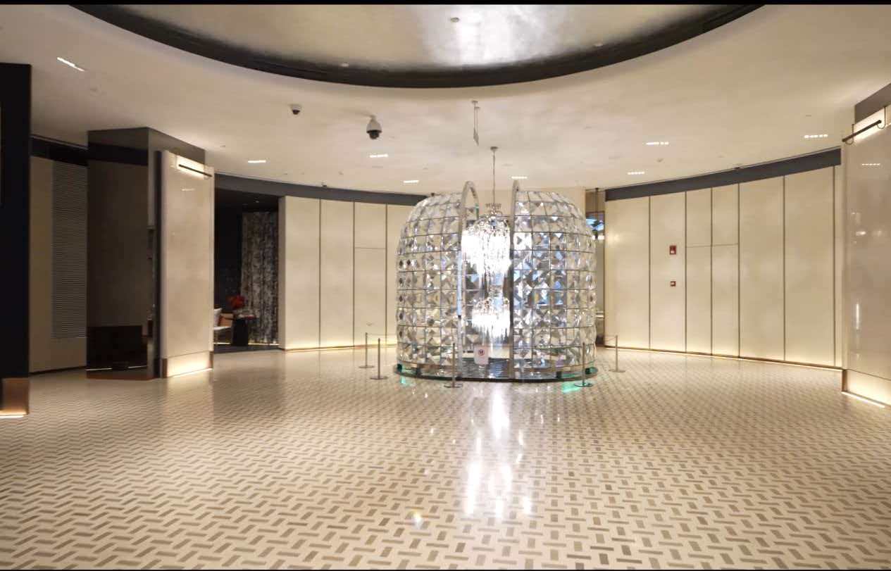 The corridors feature a custom tessellated weave pattern (Image 3 & 5). This is not a simple tile job; it is a puzzle of interlocking stone laths, requiring zero-tolerance cutting to ensure the grout lines remain razor-thin and consistent over vast areas.