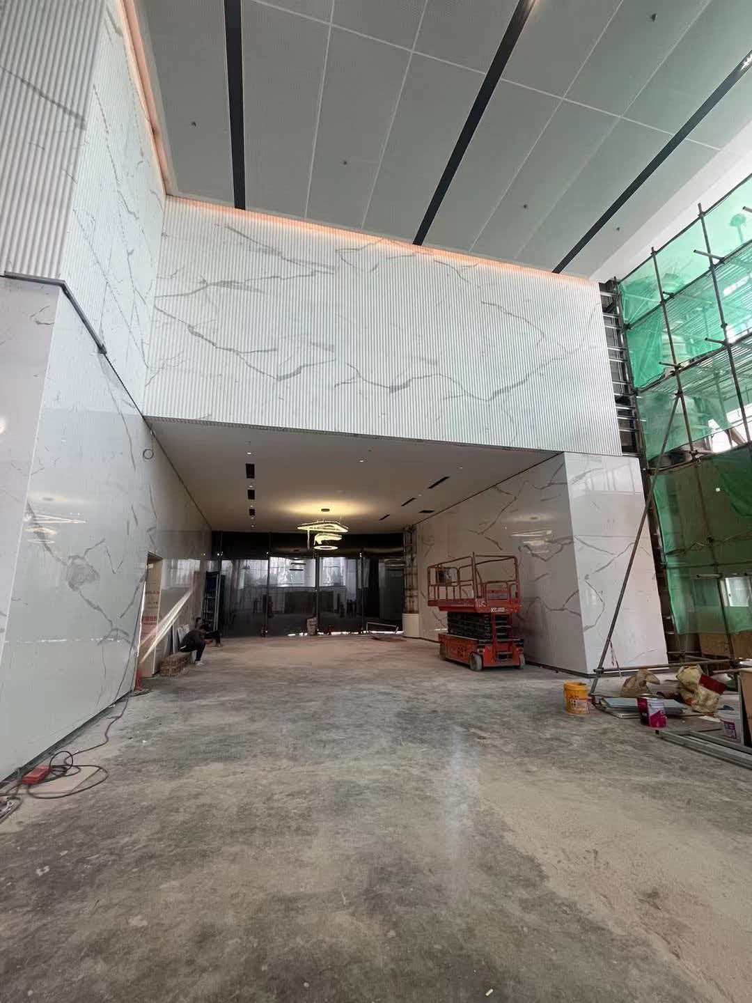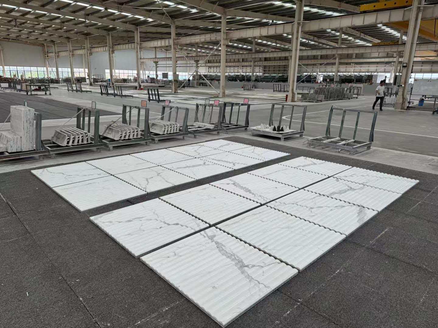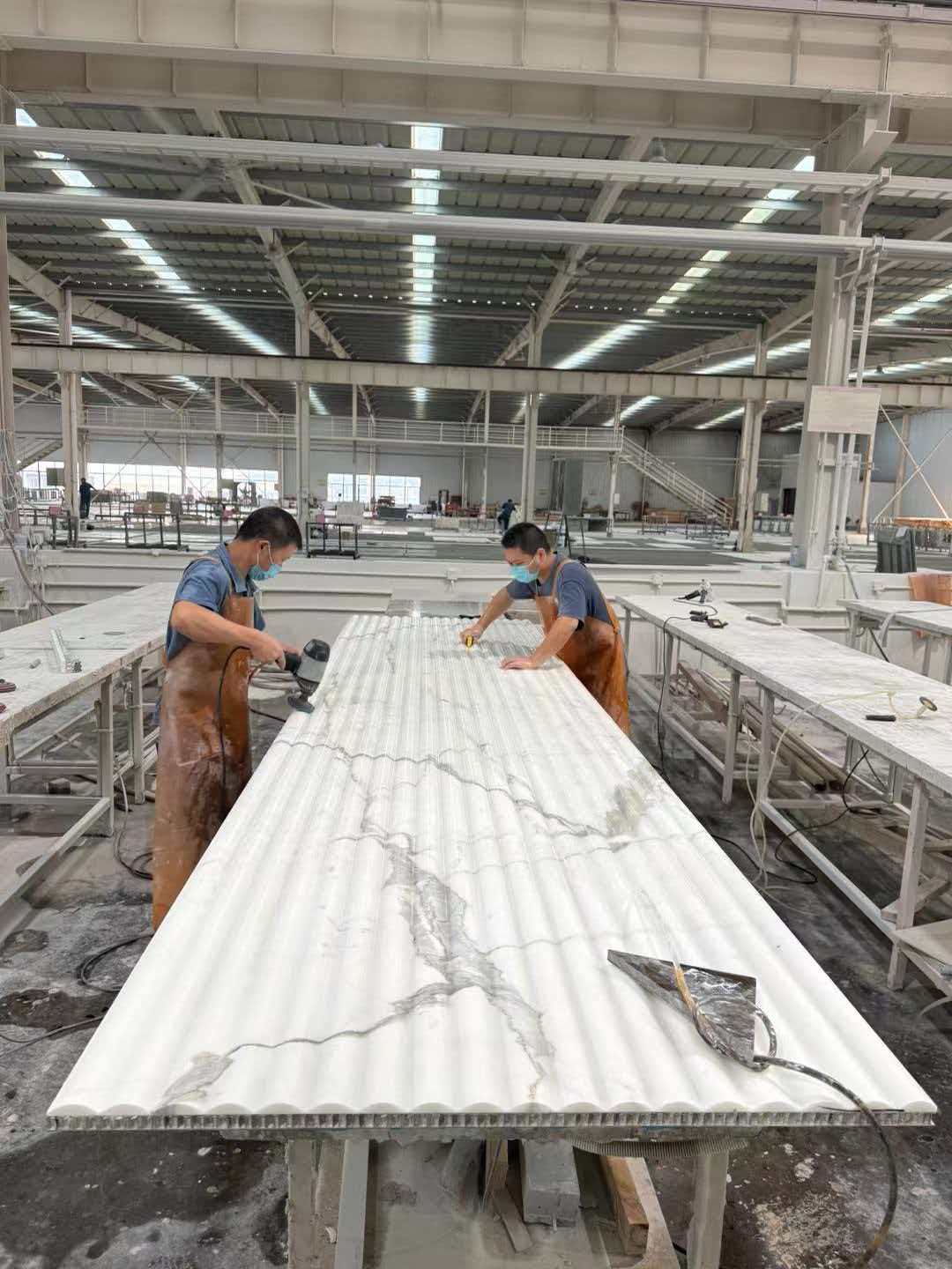 The Rhythm of Texture: CNC Fluted Panels The defining feature of the lobby's soaring elevation (Images 5 & 6) is the extensive use of linear fluted cladding. Creating these rhythmic, concave grooves in a stone as brittle as Statuario requires delicate engineering. As seen in the factory detail (Image 1), we employed Stone Aluminum Honeycomb Composite technology. By bonding a thin veneer of marble to an aerospace-grade aluminum core, we achieved the structural stability necessary to mill deep flutes without fracturing the stone. This composite approach also significantly reduced the dead load on the high walls.