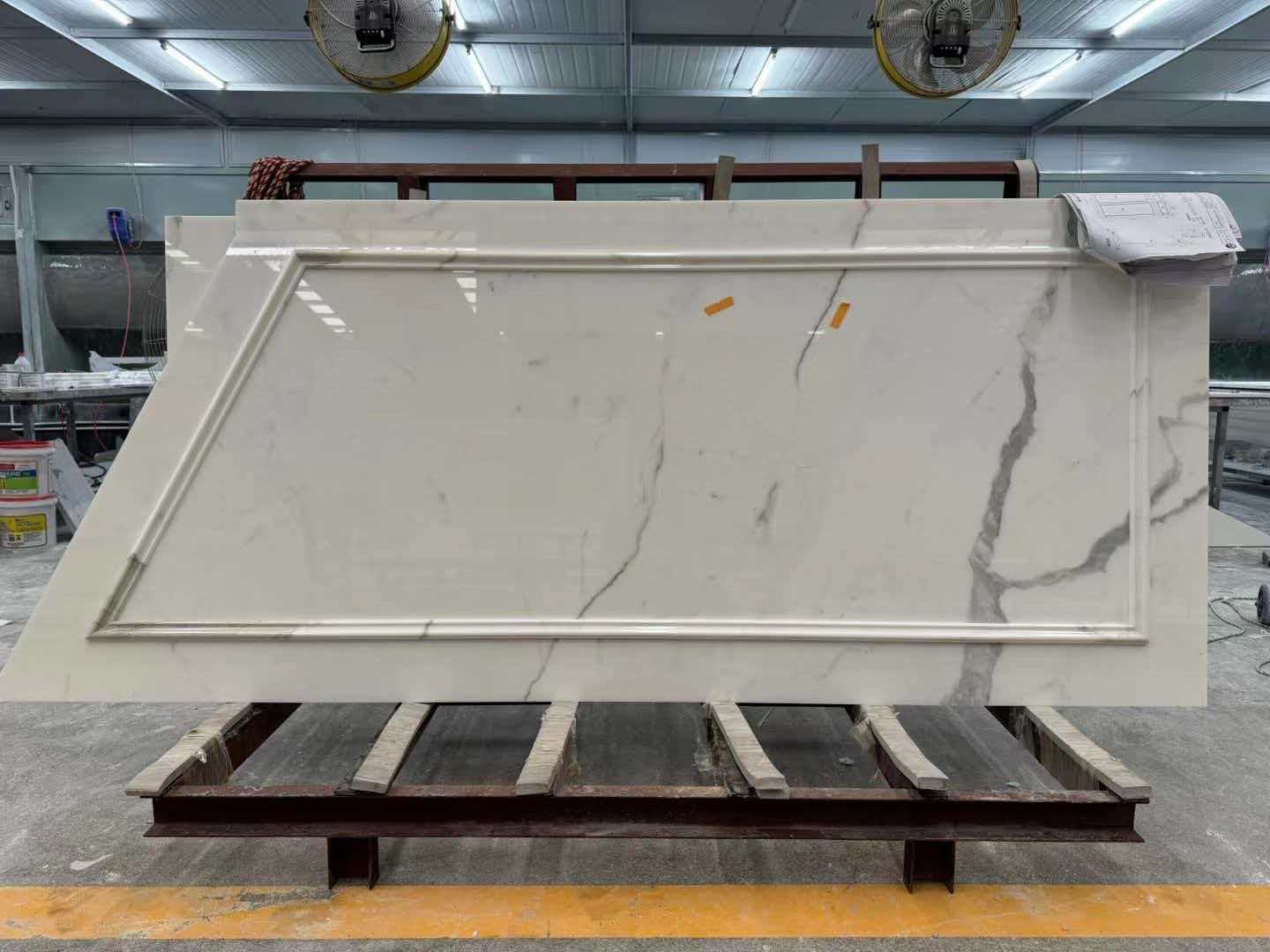 The Precision of Detail: Contemporary Boiserie Bridging the gap between classic and modern, we also fabricated bespoke stone boiserie panels (Image 4). These large-format pieces feature raised, profiled moldings integrated directly into the slab. The challenge here is vein continuity—ensuring the dramatic grey strikes of the Statuario flow uninterrupted across the flat plane and up over the raised frame, a detail verified in our rigorous factory dry-lay process (Image 3).