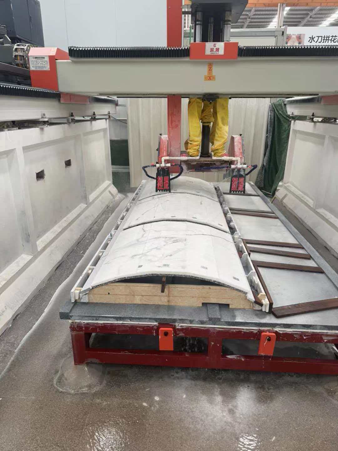 The Volume of Form: 5-Axis Sculpting While the walls celebrate linearity, other architectural elements required fluid geometry. Image 2 captures our massive 5-Axis Diamond Wire Saw in action, slicing through a solid block to create complex, curved profiles. This process allows us to liberate organic shapes from the quarry block, minimizing waste while achieving monolithic curvature that segmented tiling cannot replicate.