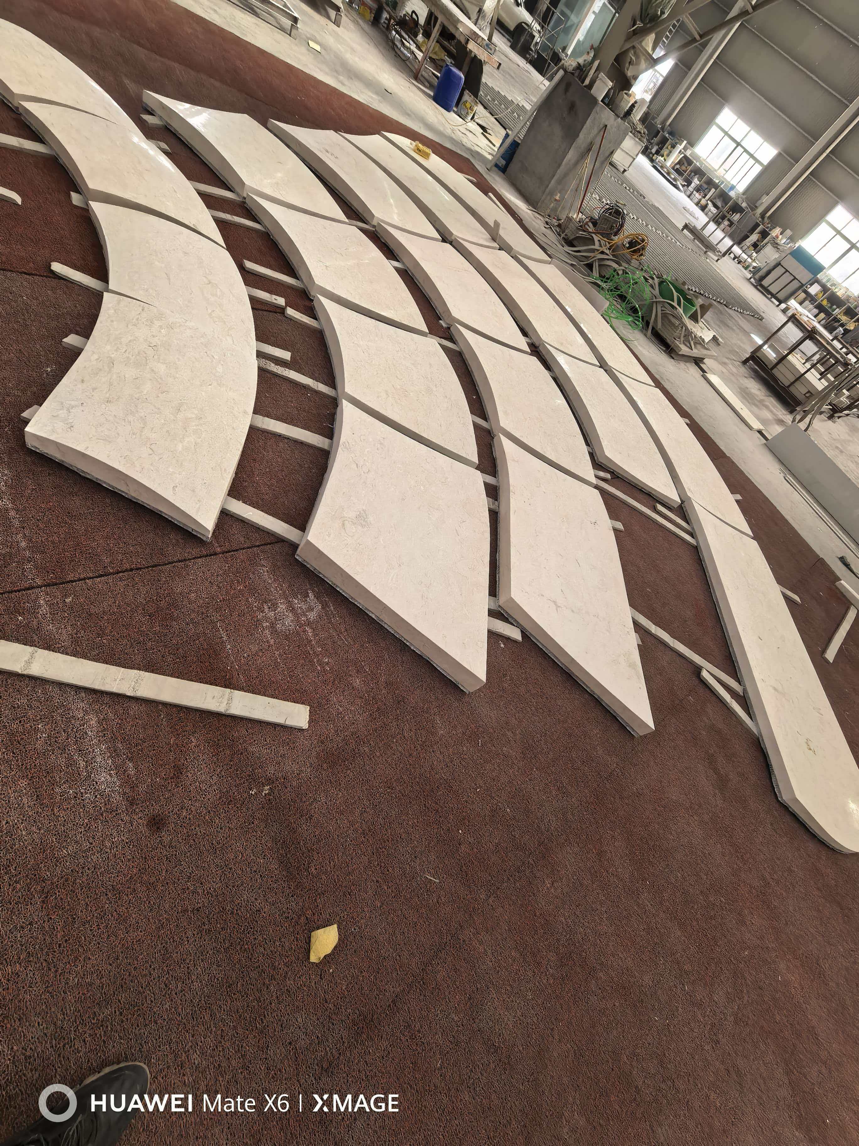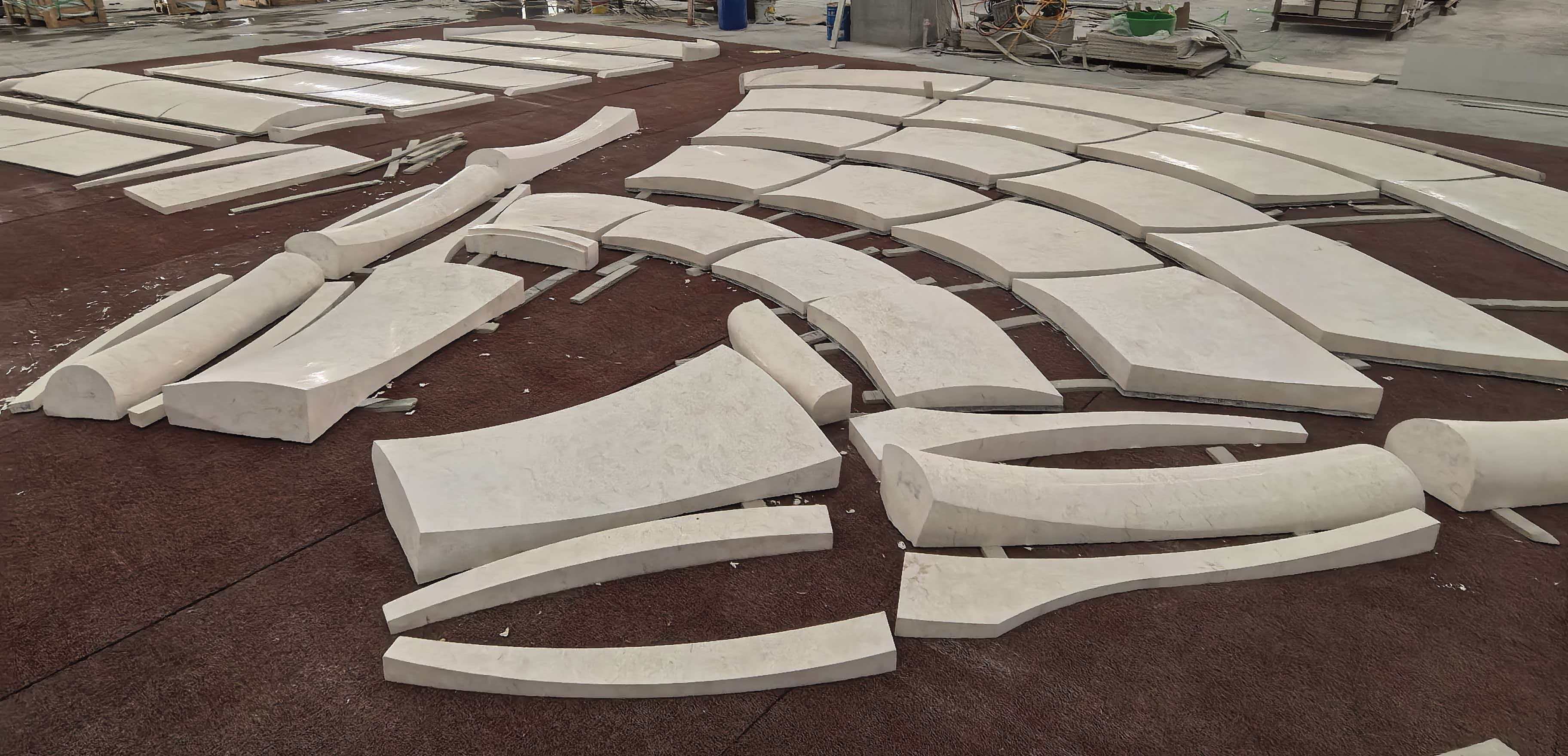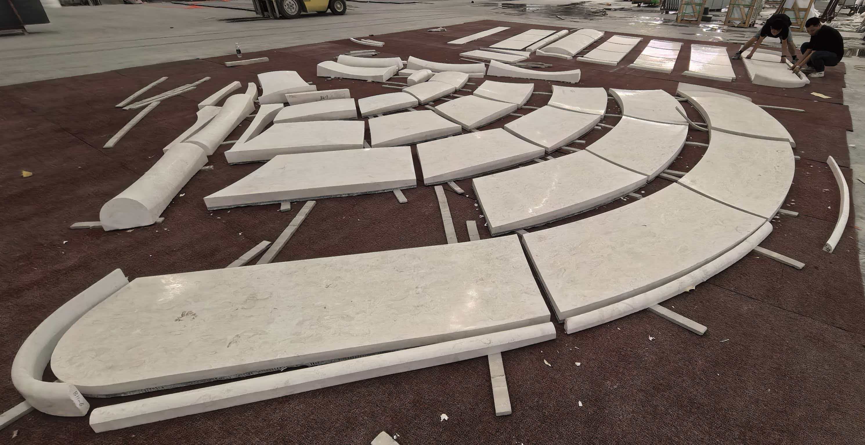 With its unique blend of beauty and workability, Perlino Beige is exceptionally versatile. It was used here to create a massive, undulating canopy and façade. This was achieved through advanced CNC wire-saw fabrication—a process that sculpted dozens of unique, 3D-curved panels. As seen in the critical dry-lay phase, this precision ensures a seamless, monolithic structure that flows around the building.